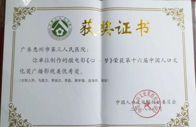 2018年9月17日,第十六屆中國人口文化獎廣播影視類頒獎儀式在河北滄州隆重舉行!惠州三院微電影《心·夢》從參評的1152個作品中脫穎而出,獲得優(yōu)秀獎的好成績!