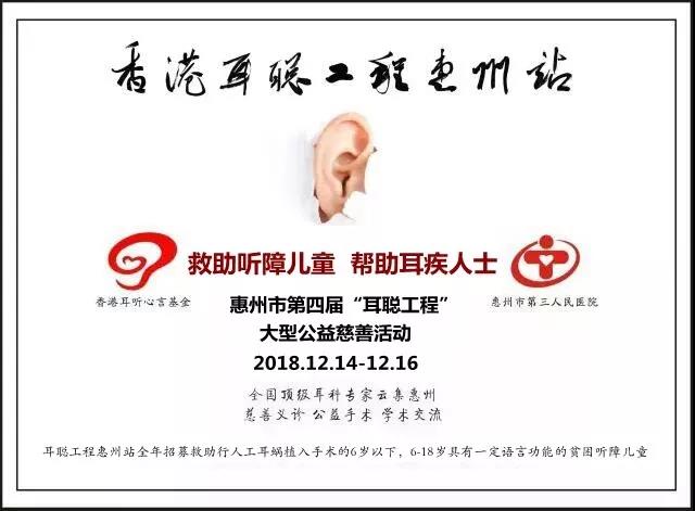 惠州市第四屆“耳聰工程”大型公益慈善活動,這是香港耳聽心言基金與惠州市第三人民醫(yī)院的第四次合作,本屆活動將有來自香港、臺灣及國內(nèi)30余名一流耳科專家為患者義診及慈善手術(shù),活動具體事項公布如下:
