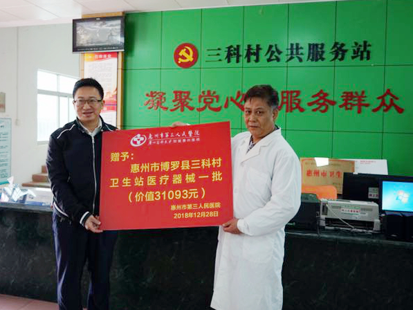 2018年12月28日上午,惠州市第三人民醫(yī)院與惠州仲裁委攜手到惠州仲裁委掛鉤幫扶的市級(jí)貧困村博羅縣麻陂鎮(zhèn)三科村舉行醫(yī)療器械捐贈(zèng)儀式?;葜葜俨梦h組書(shū)記、主任古兆嵩,惠州市第三人民醫(yī)院副院長(zhǎng)駱彪,惠州仲裁委副主任林銳,惠州市第三人民醫(yī)院社工部主任李穎紅、辦公室夏惠敬同志出席了捐贈(zèng)儀式。