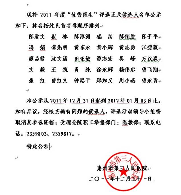 惠州市第三人民醫(yī)院2011年度“優(yōu)秀醫(yī)生”評選正式侯選人公示