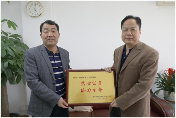 2019年3月11日下午,春光明媚,暖風(fēng)和煦?;葜菔兄行难緩埜粡?qiáng)站長(zhǎng)代表惠州市無(wú)償獻(xiàn)血領(lǐng)導(dǎo)小組辦公室專程來(lái)到惠州市第三人民醫(yī)院,將一塊寫著“熱心公益,給力生命”的牌匾交到惠州三院馬顯力院長(zhǎng)的手中,以感謝惠州三院在公益獻(xiàn)血活動(dòng)中無(wú)私大愛(ài)的付出和高尚情操!