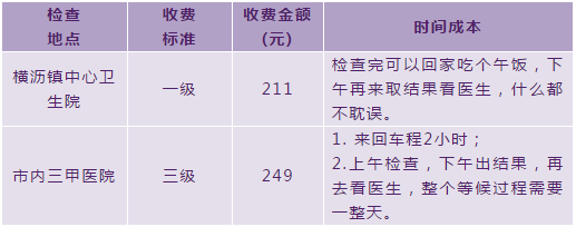 那么,群眾得到的實惠如何體現(xiàn)呢?以正式運行當天一份甲功五項的檢驗為例,李阿伯在橫瀝鎮(zhèn)中心衛(wèi)生院開單檢查和到市內(nèi)三甲醫(yī)院檢查的成本對比如下: