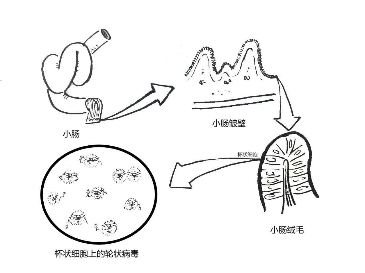 病毒入侵腸道后,在小腸絨毛頂端上復制,使其腫脹、壞死、脫落,使小兒黏膜重吸收水分,各電解質的能力受損,腸液在腸腔里大量積聚而引起腹瀉。此外,腸黏膜細胞分泌的消化酶不足,食物在消化道內(nèi)被細菌分解成短鏈的有機酸,使腸液的滲透壓升高,會進一步吸收腸道的水分,從而加重腹瀉。