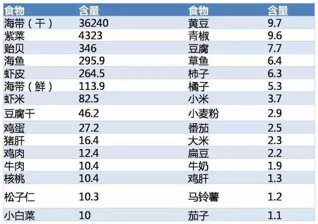 日常飲食中海帶、海魚、蛤干、干貝、紫菜、海蜇等海產品含碘量較高,其中海帶含碘量最高,其次為海魚及海貝類。陸地食品以蛋、奶含碘量較高,其次為肉類,淡水魚含碘量接近或略低于肉類,植物的含碘量最低。