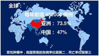 我國是胃癌大國,發(fā)病率占世界的47%左右,這幾乎占到了全球的一半,死亡率占40%左右。其中,胃癌、腸癌這兩種消化道惡性腫瘤在我國的發(fā)病率均位居前五。