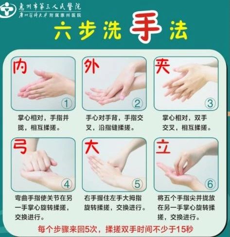 操作細(xì)節(jié):揉搓時(shí)間雙手至少15秒鐘,揉搓順序?yàn)槭终?、手背、指隙、指背(弓)、拇指、指尖、手腕。必須揉搓到位,如手背、指尖、手縫、虎口等容易忽視的部位;操作口訣是內(nèi)、外、夾、弓、大、立。