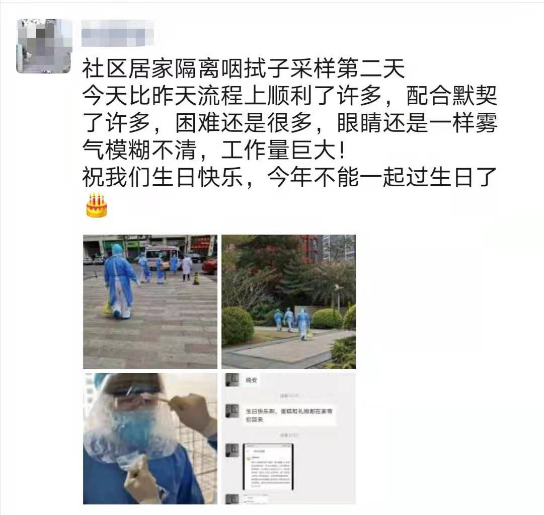 “生日快樂啊,蛋糕和禮物都在家等你回來。”2月5日凌晨12:15分,護(hù)士劉麗華收到丈夫的信息。劉麗華是這次上門采樣排查工作的組長之一。此次采樣工作時間緊、任務(wù)重,要不是在這則短信的提醒下她不會想起這天是自己的生日,她卻笑著說:“這個生日將會是我這輩子最難忘的生日了?!?/span>