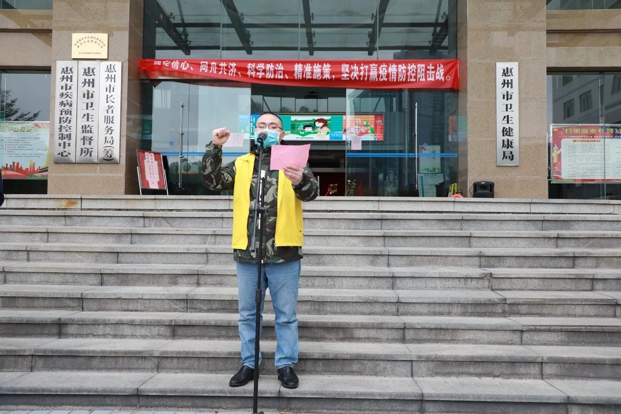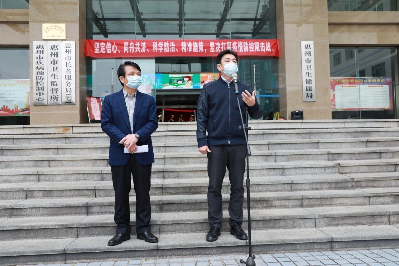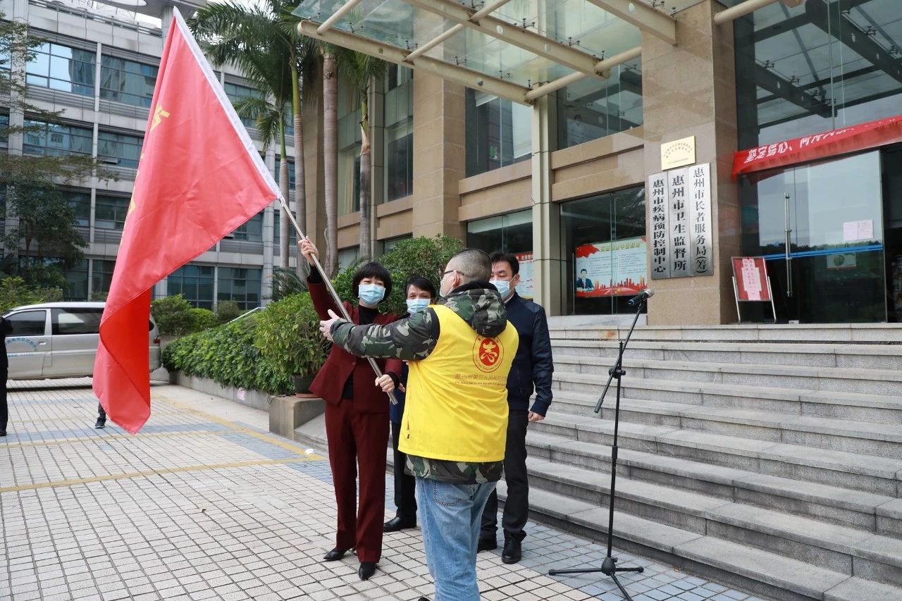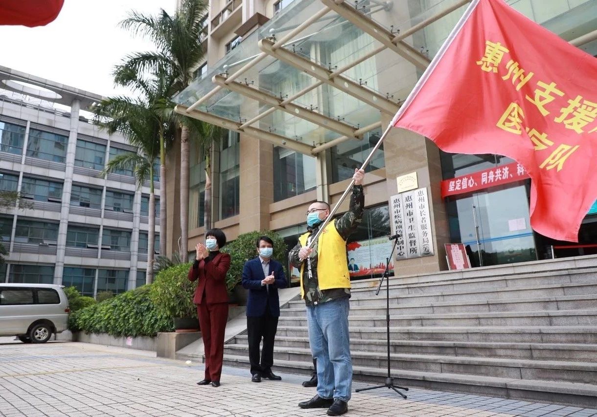 2020年2月9日上午10時30分,惠州市首批赴湖北援助醫(yī)療隊出征儀式在惠州市衛(wèi)生健康局舉行,惠州市第三人民醫(yī)院徐永輝同志代表15名醫(yī)療隊員,從惠州市副市長陳高燕手中接過授旗,莊重宣誓后立即出發(fā)馳援湖北?;葜菔行l(wèi)生健康局黨組書記、局長劉慶榮,惠城區(qū)委書記劉光濱等參加出征儀式。