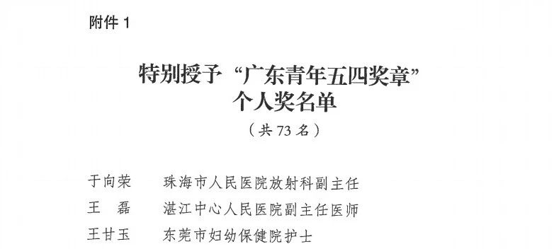 2020年5月19日,為表彰我省優(yōu)秀青年在疫情防控工作中的杰出貢獻(xiàn),更好發(fā)揮優(yōu)秀青年的引領(lǐng)模范作用,共青團(tuán)廣東省委員會(huì)、廣東省青年聯(lián)合會(huì)決定,特別授予全省73位同志及28個(gè)集體“廣東青年五四獎(jiǎng)?wù)隆?。其中?/span>