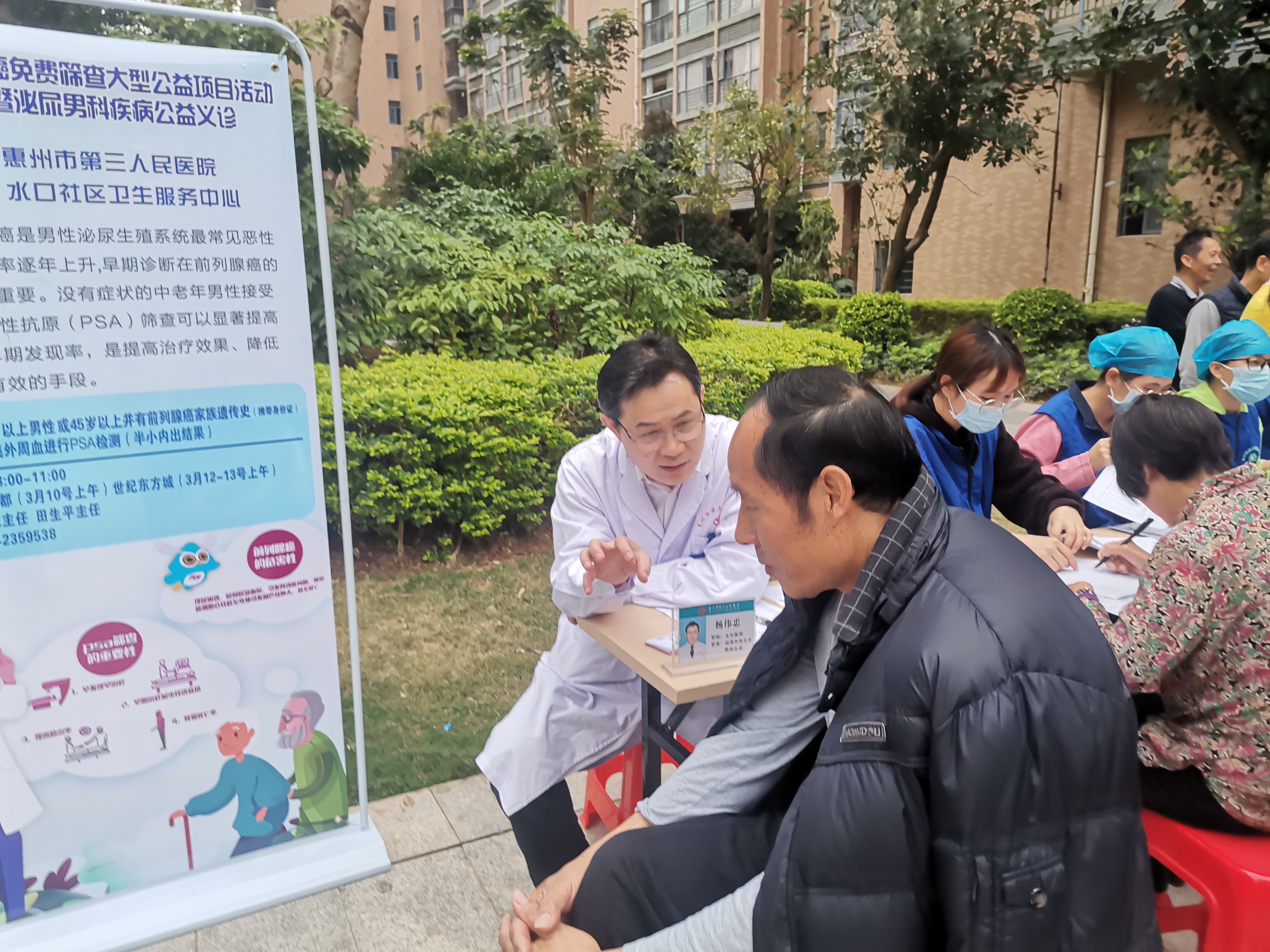 為提高老百姓對前列腺癌的認識,做到“早發(fā)現(xiàn)、早診斷、早治療”,在我院社醫(yī)部的指導(dǎo)和協(xié)助下,在水口社區(qū)衛(wèi)生服務(wù)中心的積極響應(yīng)和鼎力支持下,作為“惠城區(qū)前列腺癌免費篩查大型公益活動”的第一站,2021年3月10日上午,惠州市第三人民醫(yī)院泌尿男科醫(yī)護團隊聯(lián)合水口社區(qū)衛(wèi)生服務(wù)中心,深入江南御都社區(qū),舉行了前列腺癌免費篩查及泌尿男科疾病義診的公益活動。