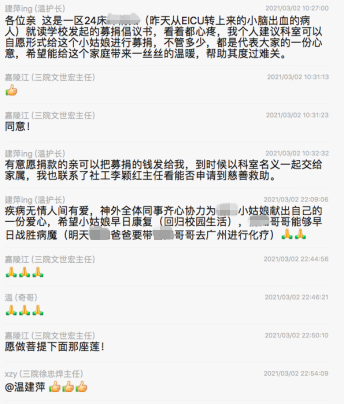 在科主任和護士長的帶領(lǐng)下,大家紛紛伸出援助之手,為患者慷慨解囊!50元、100元、200元……錢款雖不多,但凝聚了醫(yī)護人員的真情和愛心。在接過善款的那一瞬間,小倩媽媽的眼神里透露著激動和意外。