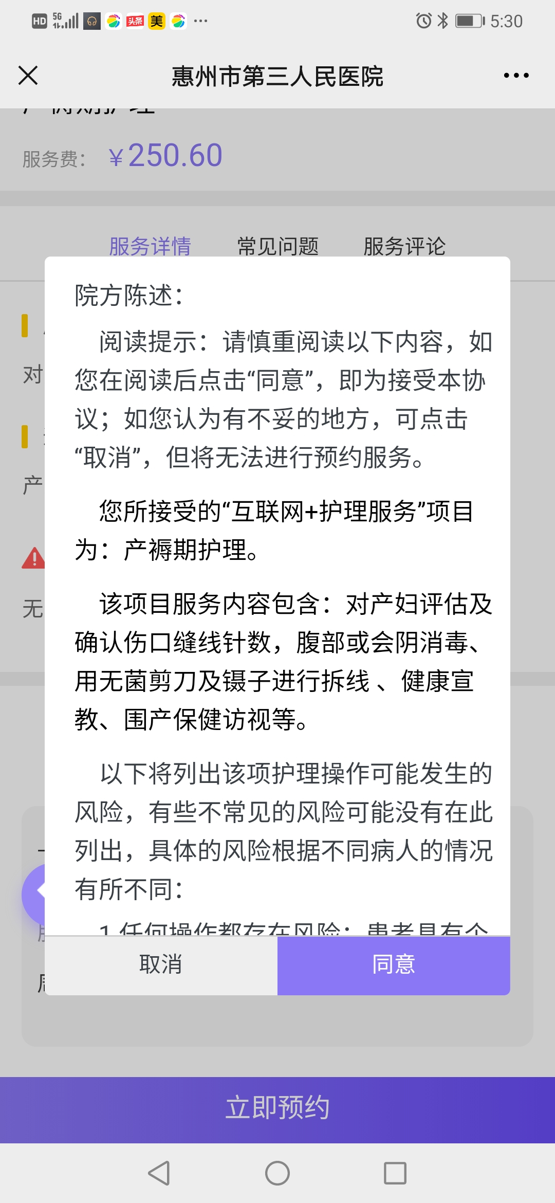 3.點擊立即預(yù)約,彈窗顯示“院方陳述”,點擊同意