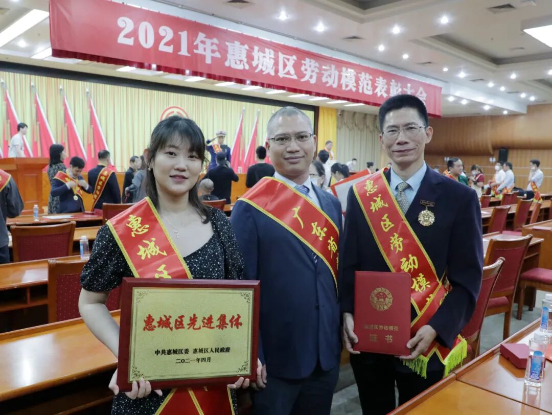 廣東省勞模陳維生(中)、惠城區(qū)勞模黃志勇(右)、惠城區(qū)先進(jìn)集體檢驗科代表李晶(左)