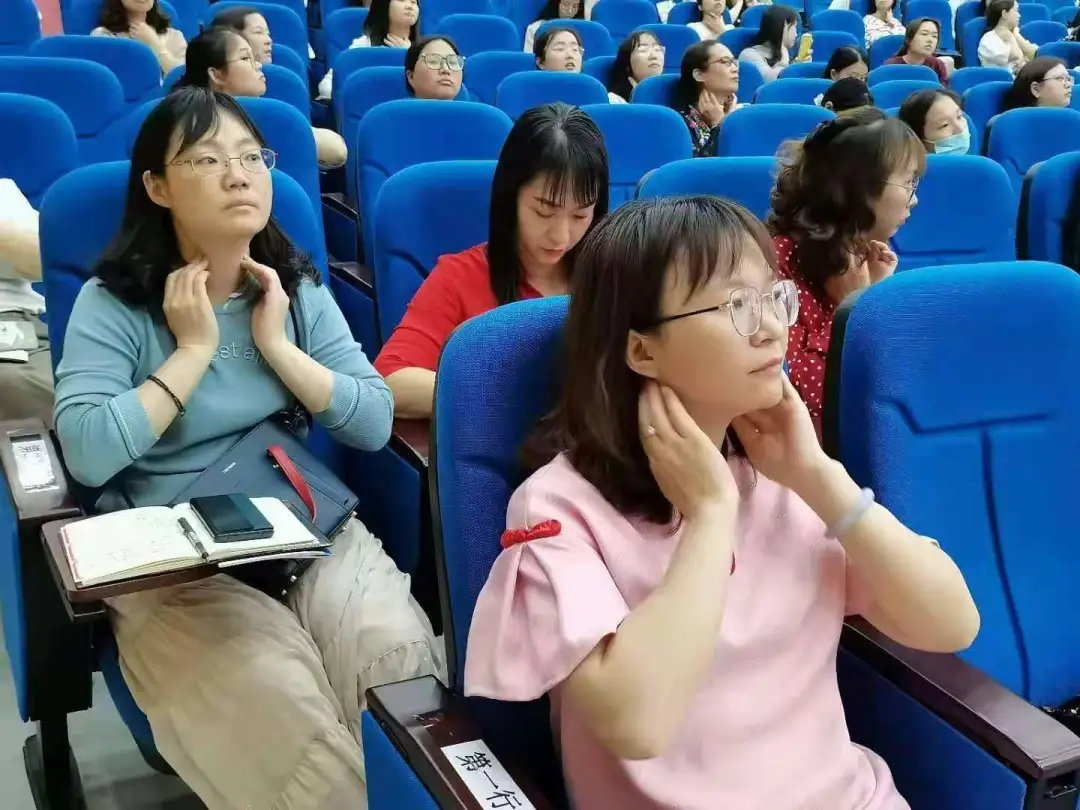 史冬梅醫(yī)生以科學用嗓,美麗嗓音為主題,詳細地講解了發(fā)聲器官的構造和以氣帶聲的科學發(fā)聲原理,通過圖片及視頻的形式讓老師們更好地理解聲帶的構成及聲帶結構疾病的預防。現(xiàn)場還通過喉部按摩、腹式呼吸及共鳴訓練等示范,介紹了護嗓的好方法。史冬梅醫(yī)生介紹,“氣泡音”是一個非常經典的護嗓方式,操作起來簡單且不受時間、空間的限制,老師們可在講課前或課間休息時,按摩喉部及練習用聲,可以讓聲帶的使用更加高效。