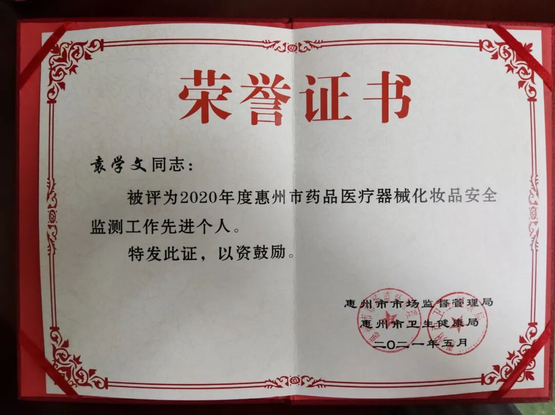 隨后,張建民副局長(zhǎng)宣讀惠州市市場(chǎng)監(jiān)督局和市衛(wèi)生健康局《關(guān)于表揚(yáng)2020年度惠州市藥品醫(yī)療器械化妝品安全監(jiān)測(cè)工作表現(xiàn)突出單位和個(gè)人的通知》?;葜萑韩@評(píng)為2020年度惠州市藥械化安全監(jiān)測(cè)工作表現(xiàn)突出單位,藥學(xué)部主任袁學(xué)文被評(píng)為2020年度惠州市藥械化安全監(jiān)測(cè)工作“先進(jìn)個(gè)人”。